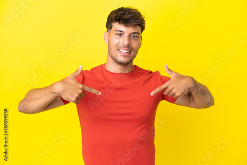 Young caucasian handsome man isolated on yellow background proud and self-satisfied