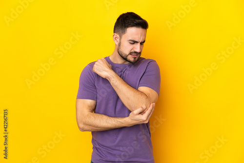Young caucasian handsome man isolated on yellow background with pain in elbow
