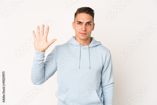 Young caucasian handsome man isolated smiling cheerful showing number five with fingers.