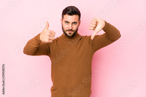 Young caucasian man against a pink background isolated showing thumbs up and thumbs down, difficult choose concept