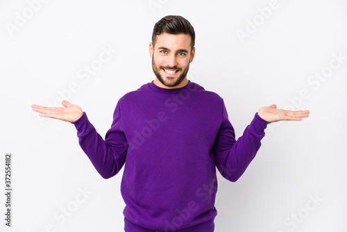 Young caucasian man against a white background isolated makes scale with arms, feels happy and confident.