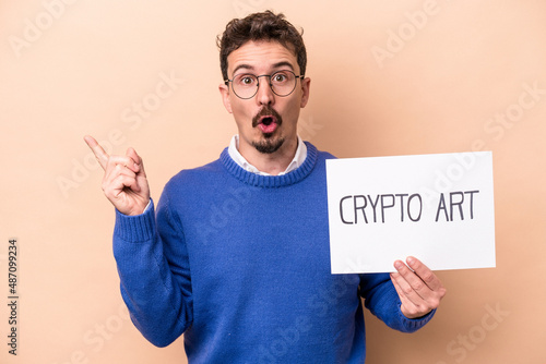 Young caucasian man holding a crypto art placard isolated on beige background pointing to the side