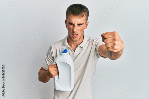 Young caucasian man holding detergent bottle annoyed and frustrated shouting with anger, yelling crazy with anger and hand raised