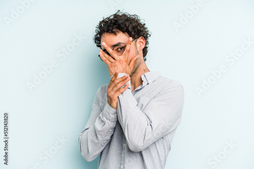 Young caucasian man isolated on blue background blink through fingers frightened and nervous.