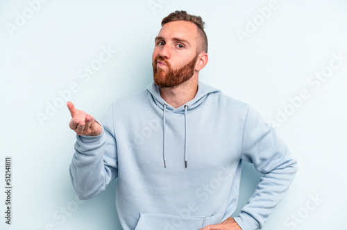 Young caucasian man isolated on blue background doubting and shrugging shoulders in questioning gesture.