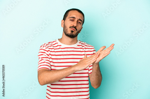 Young caucasian man isolated on blue background feeling energetic and comfortable, rubbing hands confident.