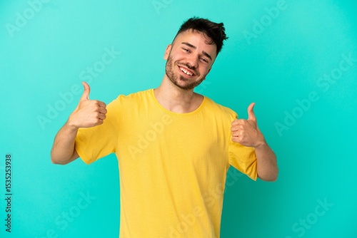 Young caucasian man isolated on blue background giving a thumbs up gesture