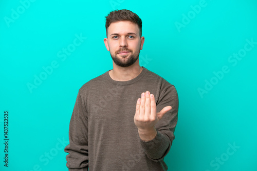 Young caucasian man isolated on blue background inviting to come with hand. Happy that you came