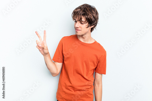 Young caucasian man isolated on blue background joyful and carefree showing a peace symbol with fingers.