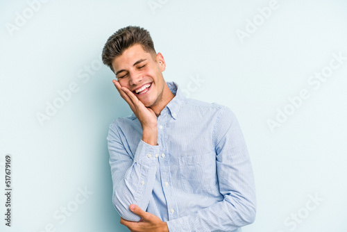 Young caucasian man isolated on blue background laughs happily and has fun keeping hands on stomach.