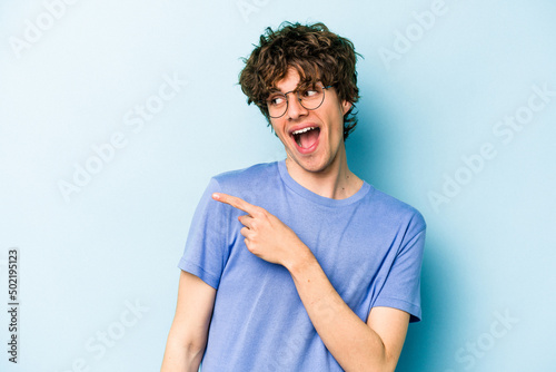 Young caucasian man isolated on blue background looks aside smiling, cheerful and pleasant.