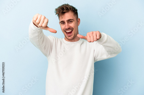 Young caucasian man isolated on blue background raising both thumbs up, smiling and confident.