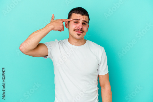 Young caucasian man isolated on blue background showing a disappointment gesture with forefinger.