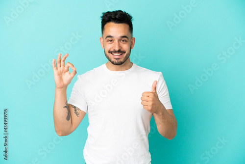Young caucasian man isolated on blue background showing ok sign and thumb up gesture