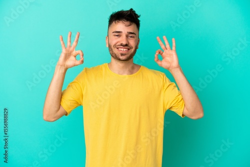 Young caucasian man isolated on blue background showing ok sign with two hands