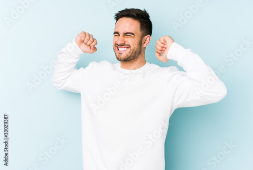 Young caucasian man isolated on blue background stretching arms, relaxed position.