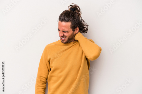 Young caucasian man isolated on gray background having a neck pain due to stress, massaging and touching it with hand.