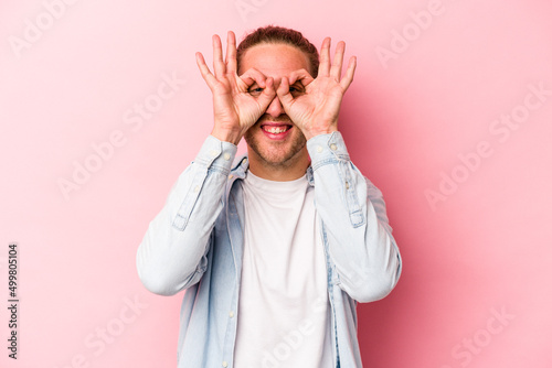 Young caucasian man isolated on pink background excited keeping ok gesture on eye.