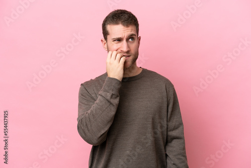 Young caucasian man isolated on pink background is a little bit nervous