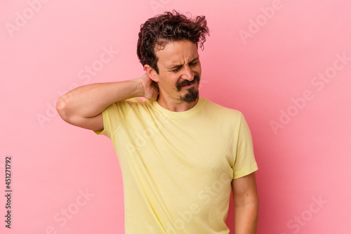 Young caucasian man isolated on pink background suffering neck pain due to sedentary lifestyle.