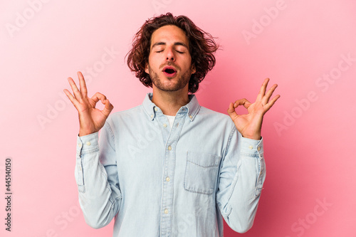 Young caucasian man isolated on pink bakcground relaxes after hard working day, she is performing yoga.