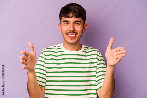 Young caucasian man isolated on purple background holding something with both hands, product presentation.