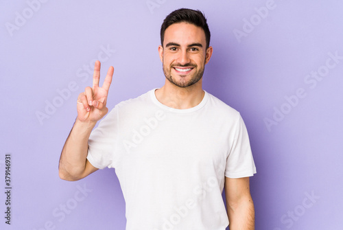 Young caucasian man isolated on purple background showing victory sign and smiling broadly.