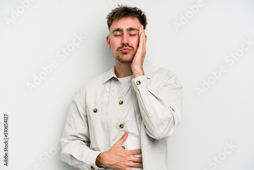 Young caucasian man isolated on white background blows cheeks, has tired expression. Facial expression concept.