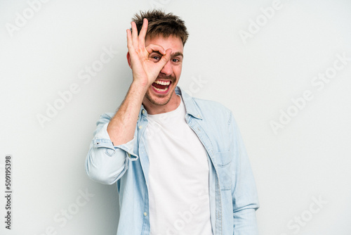 Young caucasian man isolated on white background excited keeping ok gesture on eye.