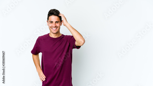 Young caucasian man isolated on white background joyful laughing a lot. Happiness concept.