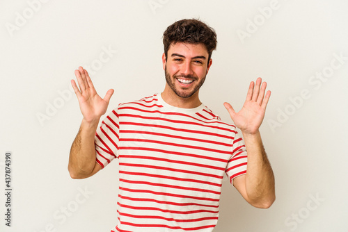 Young caucasian man isolated on white background joyful laughing a lot. Happiness concept.