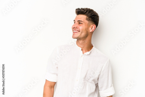Young caucasian man isolated on white background relaxed and happy laughing, neck stretched showing teeth.