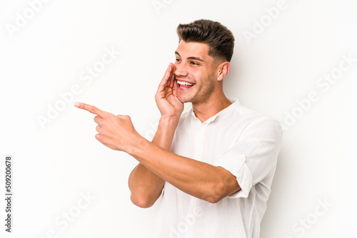 Young caucasian man isolated on white background saying a gossip, pointing to side reporting something.