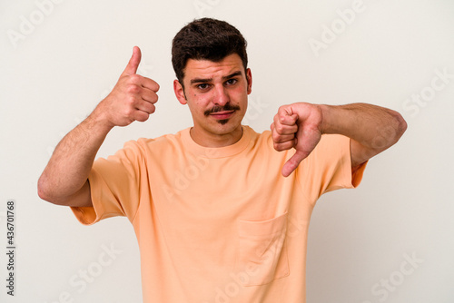 Young caucasian man isolated on white background showing thumbs up and thumbs down, difficult choose concept