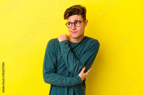 Young caucasian man isolated on yellow background confused, feels doubtful and unsure.