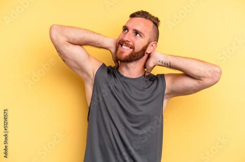 Young caucasian man isolated on yellow background feeling confident, with hands behind the head.