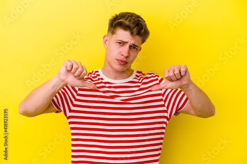 Young caucasian man isolated on yellow background showing a dislike gesture, thumbs down. Disagreement concept.
