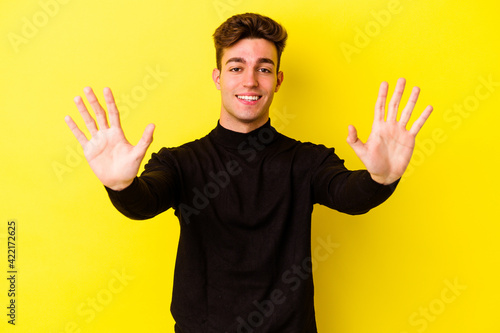 Young caucasian man isolated on yellow background showing number ten with hands.
