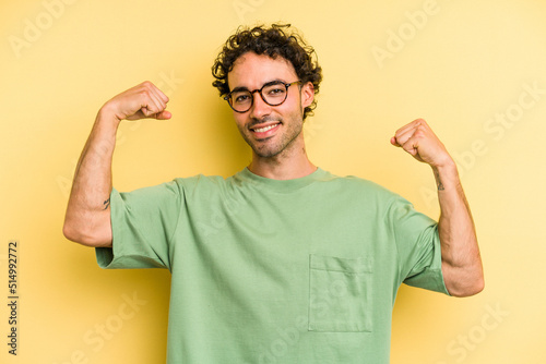 Young caucasian man isolated on yellow background showing strength gesture with arms, symbol of feminine power