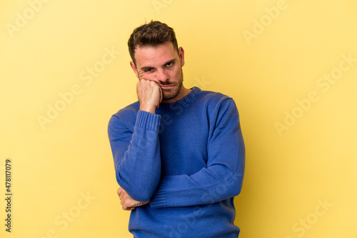 Young caucasian man isolated on yellow background tired of a repetitive task.