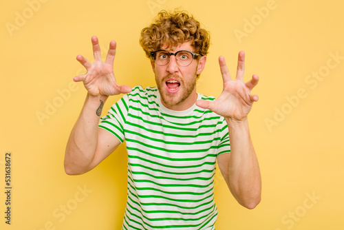 Young caucasian man isolated on yellow background upset screaming with tense hands.