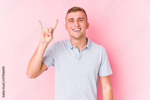 Young caucasian man isolated showing a horns gesture as a revolution concept.
