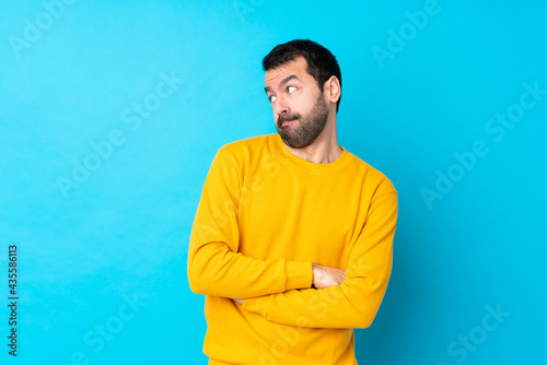 Young caucasian man over isolated blue background making doubts gesture looking side