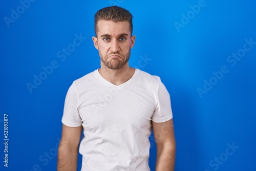 Young caucasian man standing over blue background depressed and worry for distress, crying angry and afraid. sad expression.