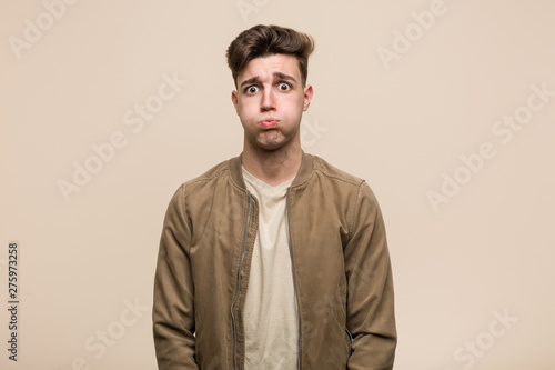 Young caucasian man wearing a brown jacket blows cheeks, has tired expression. Facial expression concept.