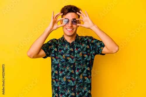 Young caucasian man wearing a Hawaiian shirt isolated on yellow background showing okay sign over eyes