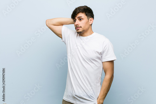 Young caucasian man wearing a white tshirt touching back of head, thinking and making a choice.