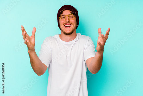 Young caucasian man wearing a wool hat isolated on blue background receiving a pleasant surprise, excited and raising hands.