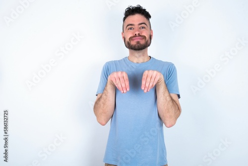 Young caucasian man wearing blue T-shirt over white background makes bunny paws and looks with innocent expression plays with her little kid