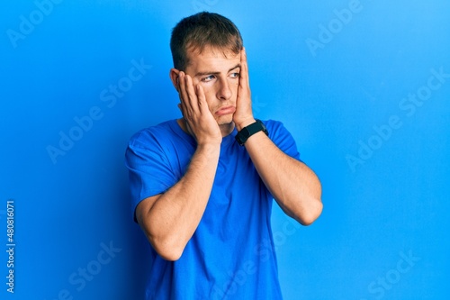 Young caucasian man wearing casual blue t shirt tired hands covering face, depression and sadness, upset and irritated for problem